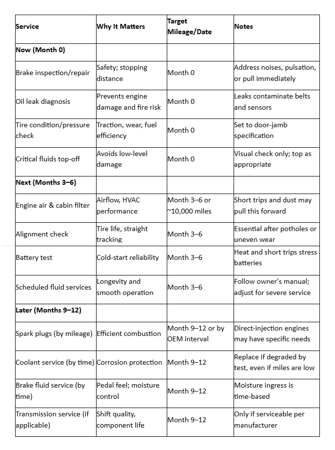 Below is a planning framework for a typical 12-month cycle. Exact timing should follow your owner's manual and the inspection findings—these are planning anchors, not fixed promises.