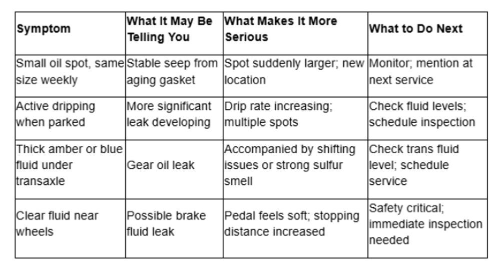 A small, stable seep is different from a new or fast-growing leak pattern. The warning sign is not only the presence of fluid—it is the change in pattern, location, size, and frequency, especially when paired with smell or drivability change.