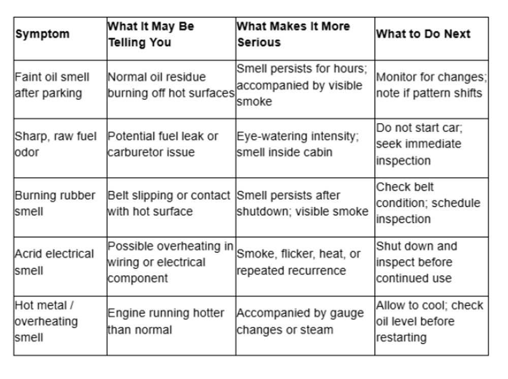 Burning rubber belongs in the same caution zone. So does an acrid electrical smell. Those odors suggest heat, friction, or electrical trouble rather than harmless old-car atmosphere. A useful way to sort smell clues is this: