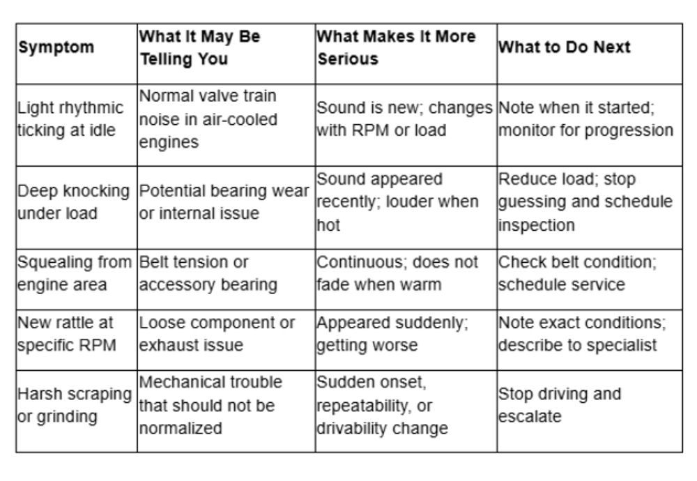 A light, rhythmic ticking at idle that has been present for years and does not change with temperature or load? That is likely valve train noise, normal in air-cooled engines, and nothing to lose sleep over. But a tick that appeared last Tuesday, or a tick that gets louder when you accelerate, or one that was not there when the engine was cold but shows up after twenty minutes of driving—these changes carry meaning.