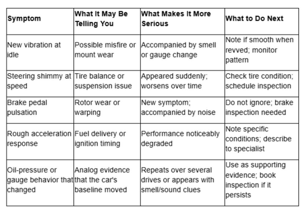 No single symptom tells the whole story. A slight vibration at idle might mean nothing. A slight vibration at idle combined with a new oil smell and a spot on the garage floor? That pattern suggests something worth investigating.