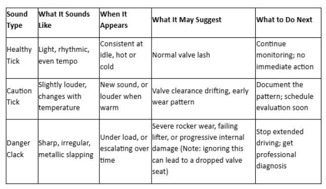 Not all valve-train sounds mean trouble. The key is learning to distinguish between a healthy tick, a caution tick, and a danger clack.