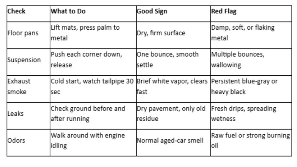 These checks are screening tools—a way to sort promising cars from obvious money pits. They catch red flags hiding in plain sight: hidden rust, blown suspension, active leaks, and safety hazards.