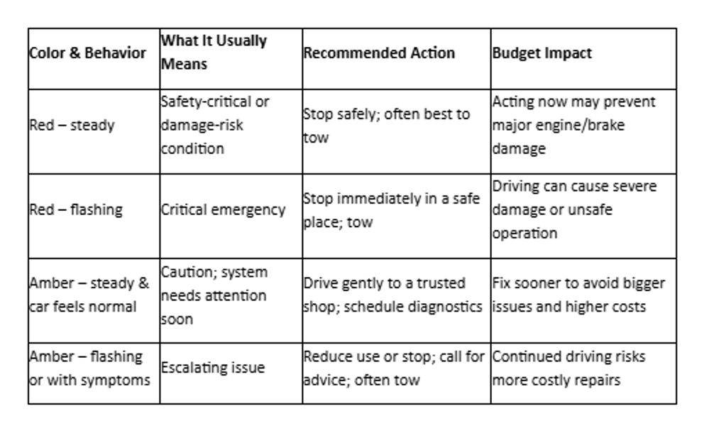 - Color Is Your First Clue: Red means stop safely and often tow, amber means caution with time to plan, and flashing elevates urgency beyond a steady light of the same color.